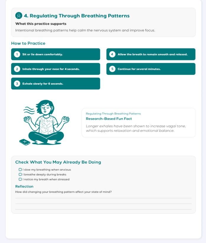 - Regulating Through Breathing Patterns: Uses intentional breath ratios (4-second inhale, 6-second exhale)