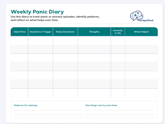 Print multiple copies or save as a reusable digital template. Encourage clients to complete an entry as soon as possible after a panic episode, ideally within the same day while details are still fresh.